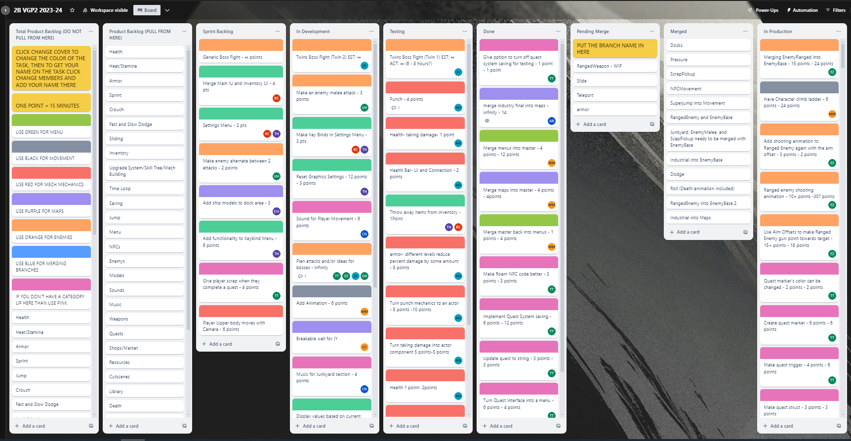Another tool students use is the Trello Board. The Trello Board has cards representing the tasks they worked on for the sprint, including an estimated amount of "points" the task will take and the actual number of "points" it took. For this class, one point roughly estimates to fifteen minutes. Cards also include who is working on the task and a color label for the category.Â